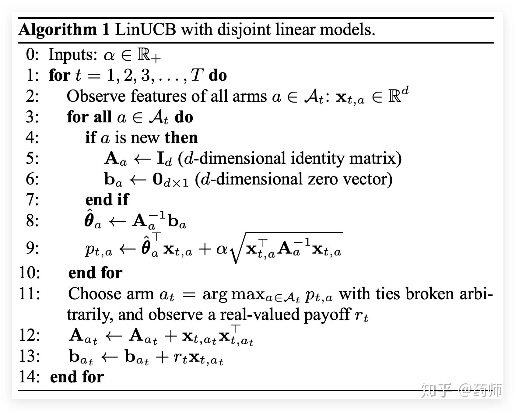 上图是论文中给出的 LinUCB 算法,其中参数 决定了 Explore 的程度。如第二行所示,首先获取每一个 arm 的特征向量