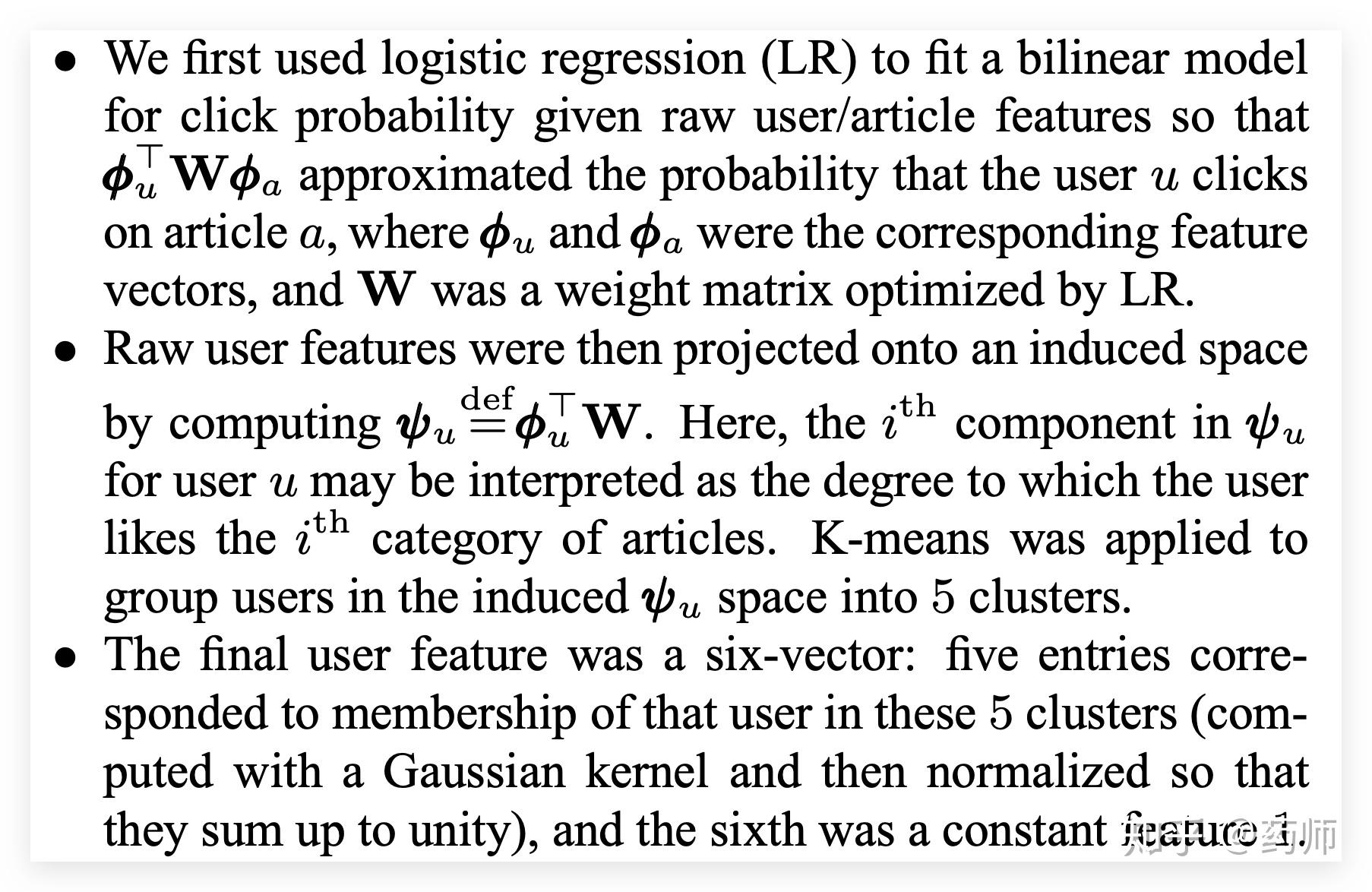 LinUCB 算法有一个很重要的步骤,就是给 User 和 Item 构建特征,也就是刻画 context。在原始论文里,Item 是文章,其中专门介绍了它们是怎么构建特征的。