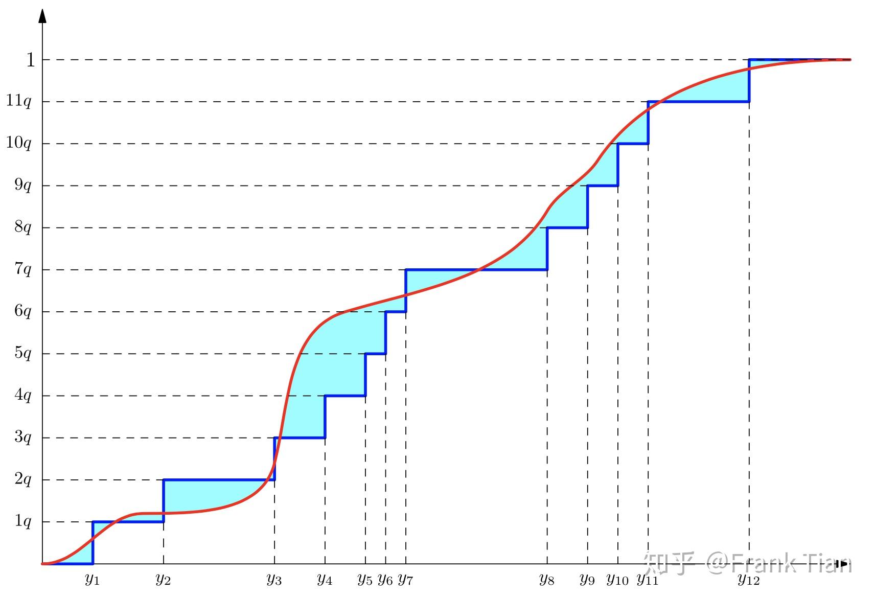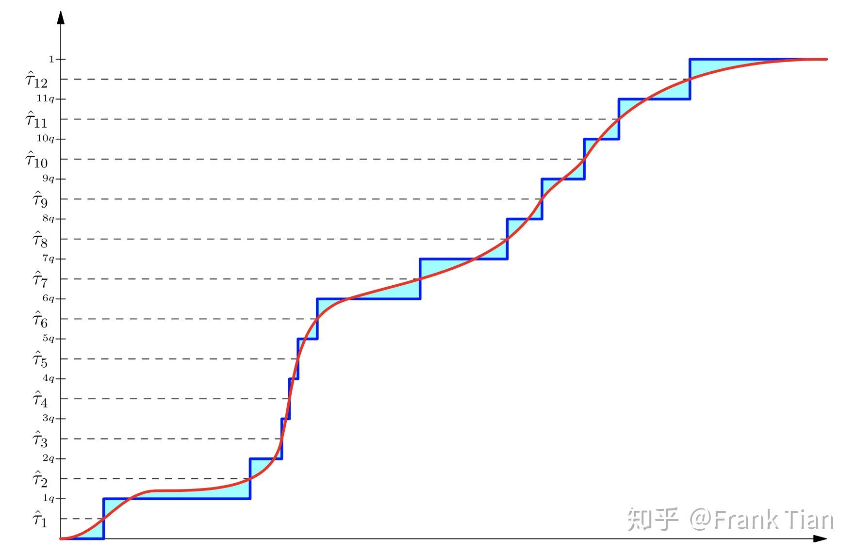 上图中红色和蓝色的线分别是 和 的CDF函数,对于某一个分位数 ,我们可以计算得到两个值,分别是 和 。