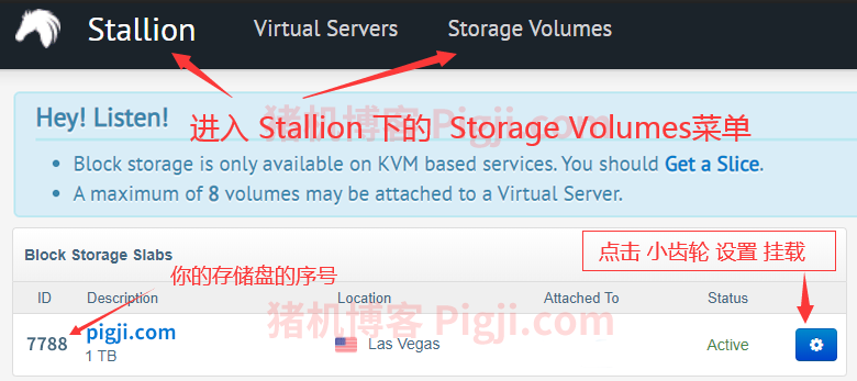 点击齿轮进入设置,选择:“Attach to Virtual Server”,确认挂载存储块(Block Storage Slab)到的你的对应的VPS上。