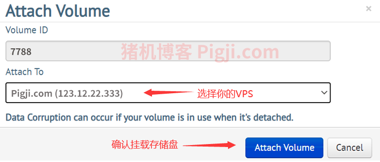 到控制面板将 存储块 绑定到 相应的 VPS上